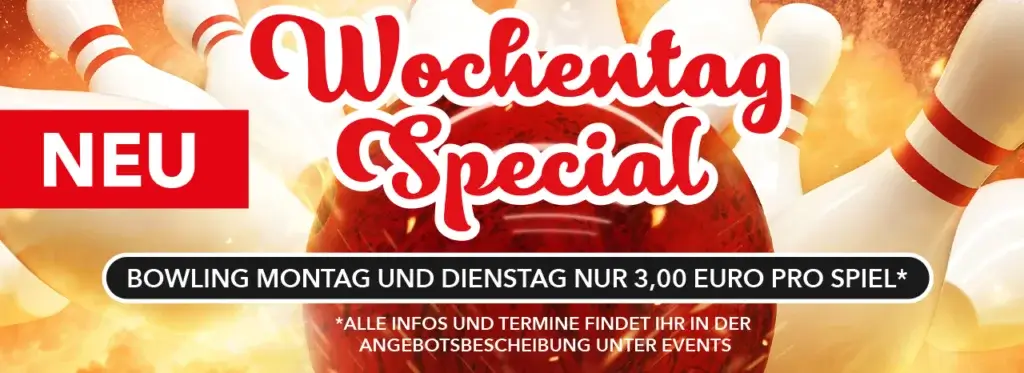Einmal im Monat könnt ihr Montag und Dienstag zum vergünstigten Preis Bowling spielen. Und das ist noch nicht alles: Spielt im Wochentag Special eine 111 als Endergebnis und ihr bekommt ein Getränk von uns aufs Haus.* Jetzt Termin aussuchen und reservieren.